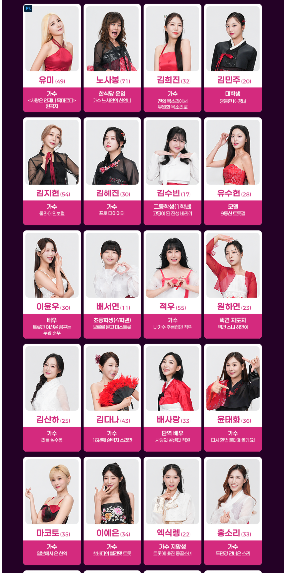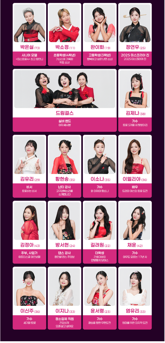 이 외에도 국악·성악·민요 기반 참가자들이 다수 포진해 있어 장르적 다양성이 매우 큽니다.