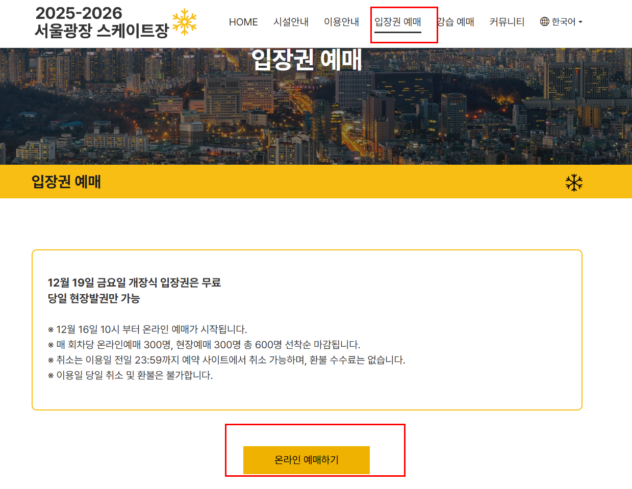 서울광장 스케이트장 예약 방법은 온라인 예매 + 현장 예매 두 가지입니다.