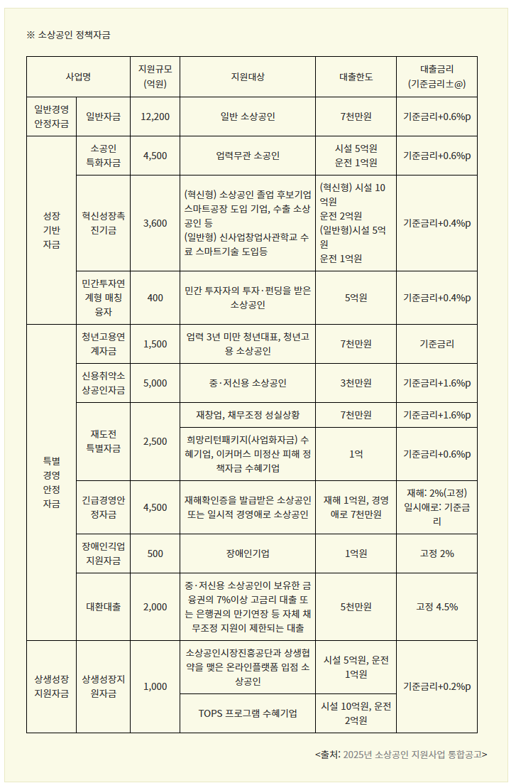 | 일반경영안정자금 | 최대 7,000만 원 | 연 2.5~3.0% | 운영자금 |