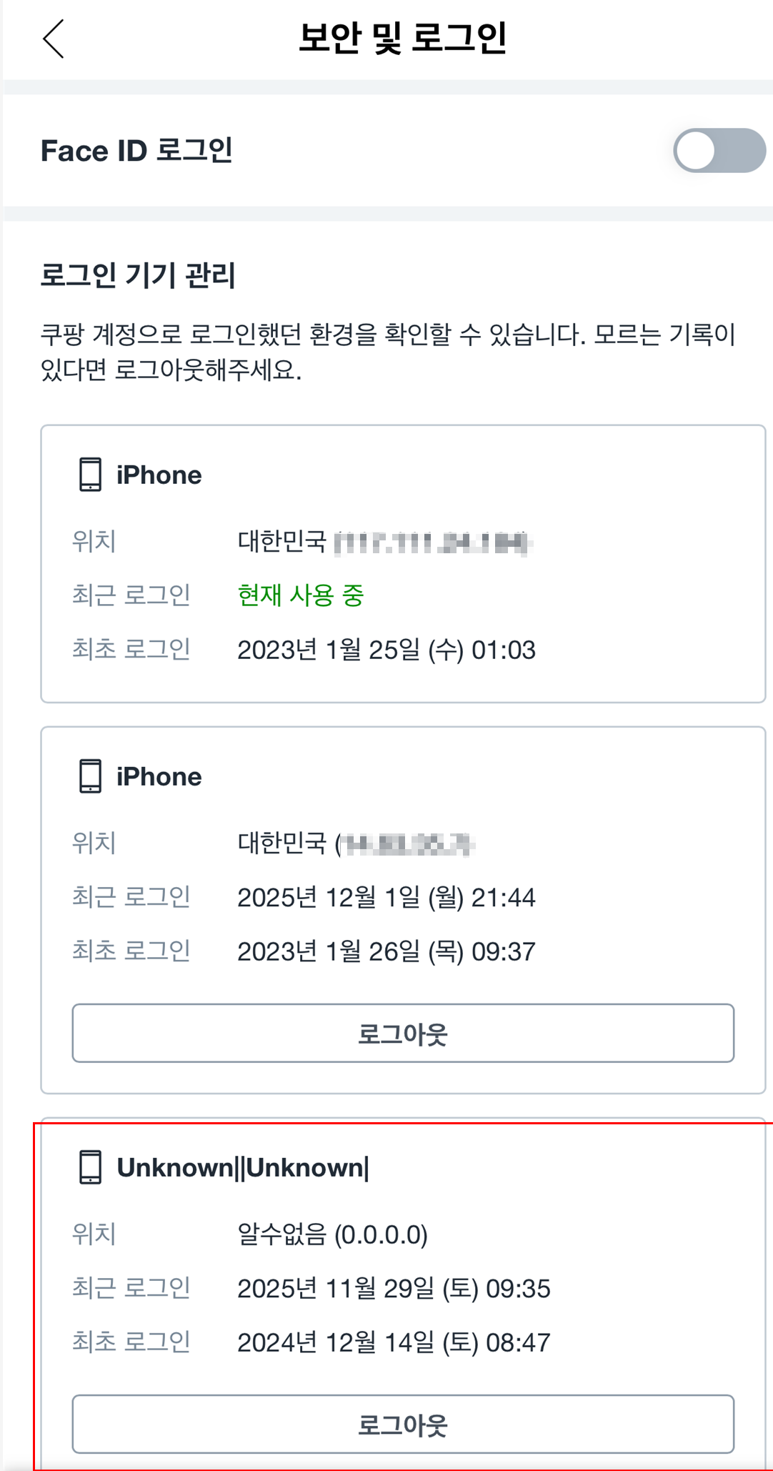 ➡ 내가 아닌 낯선 지역(IP Unknown/해외) 접속이 보이면