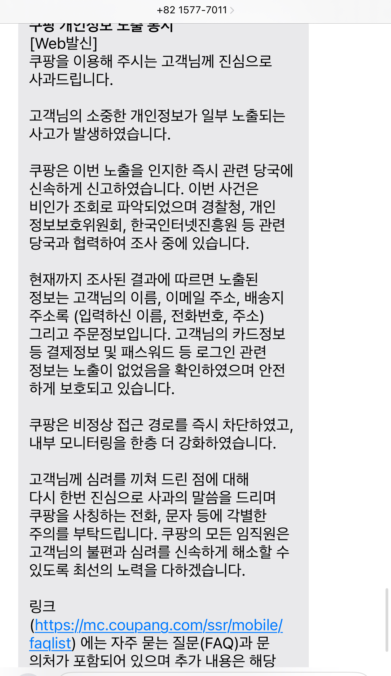 쿠팡에서 “개인정보가 유출된 것으로 확인됐다”는 문자를 받았다면 공식 피해 대상자로 분류된 상태입니다.