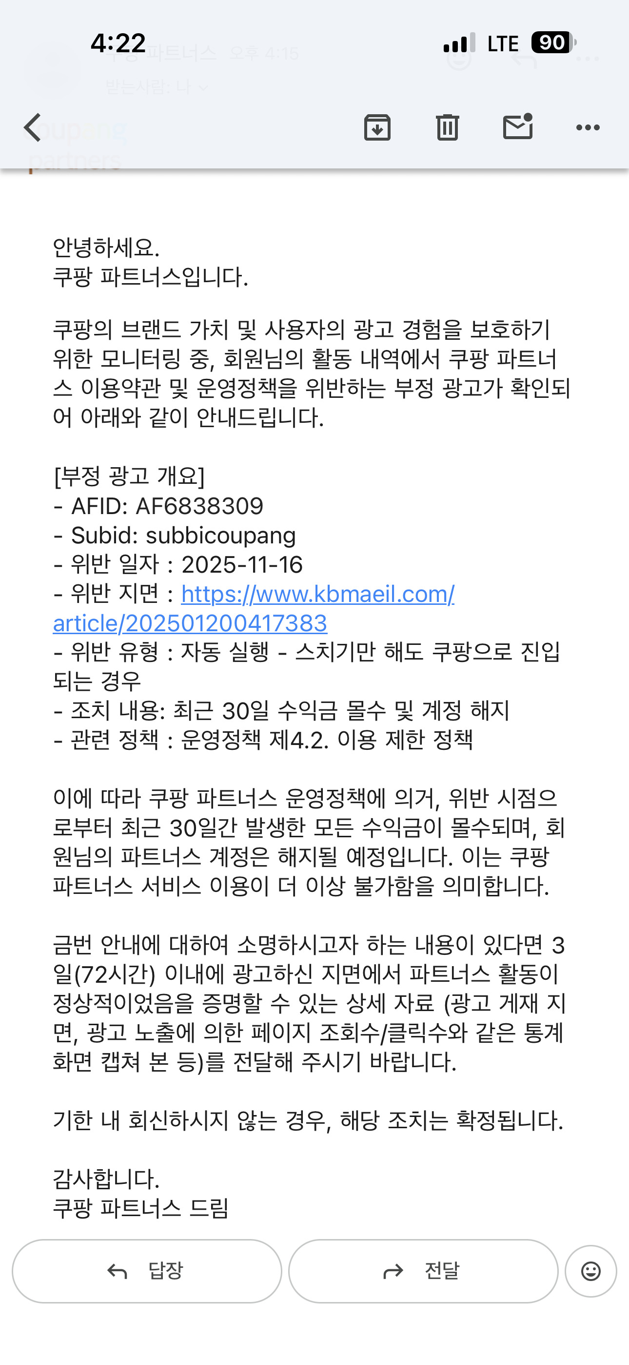 실제로 받은 쿠팡 파트너스 ‘계정 해지’ 메일 내용