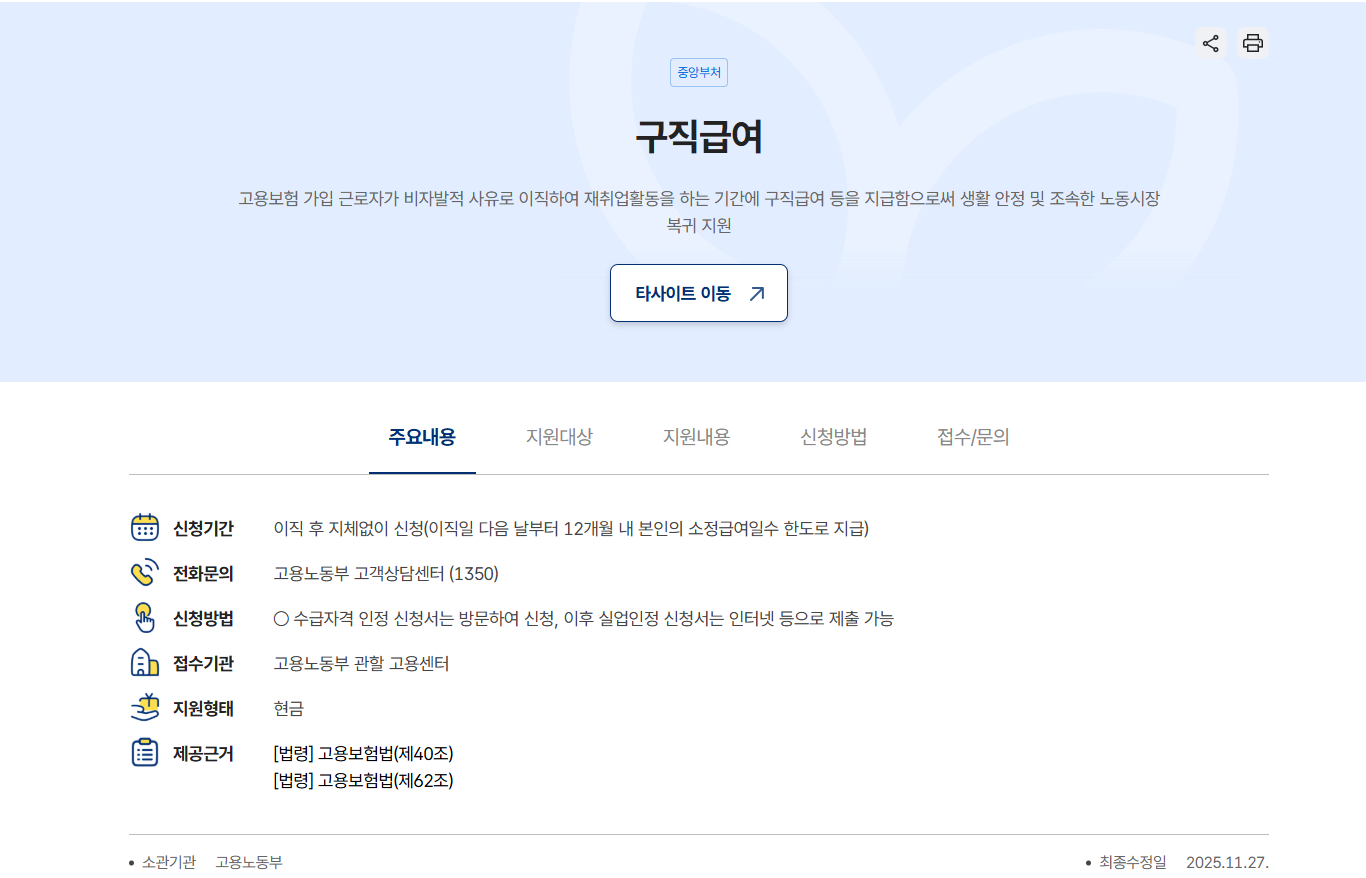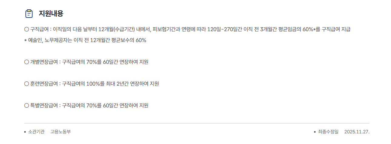 - 재취업 준비 기간 확보 를 돕는 사회안전망입니다.