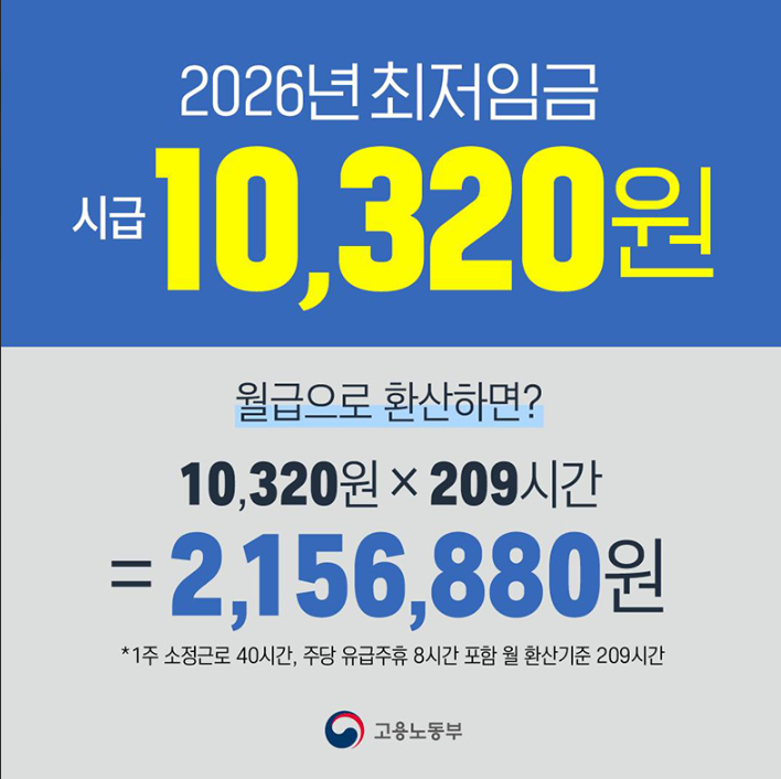 2026년 최저임금이 시급 10,320원으로 공식 확정되었습니다.